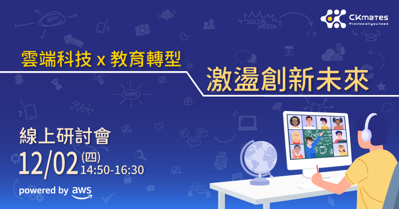 在此研討會中,將與您分享 CKmates 與 AWS 如何透過雲端服務提升學習體驗、滿足擴展的學習需求,並邀請 Vpon 大數據分析專家,分享以 AI 人工智慧及大數據分析用戶行為,與您一同抓緊態勢乘勝追擊,創造未來發展之商機。